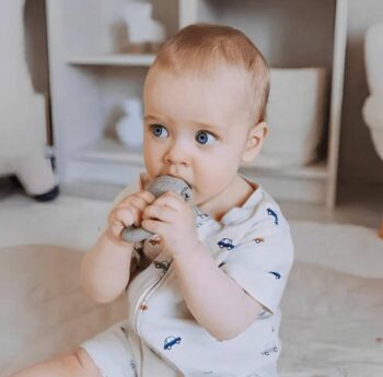 Gancho para cuna o cochecito de silicona con mordillo con forma de piña incluído.
