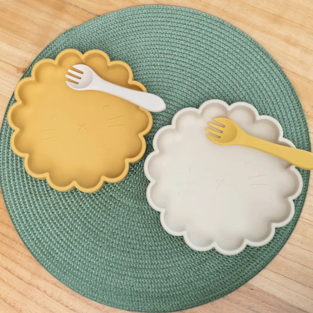 Plato de silicona con tapa + cubiertos de silicona con mango de madera.