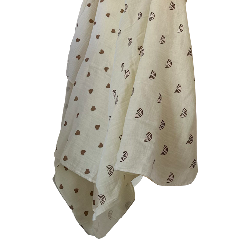 Manta muselina 100% algodón color natural con estampa de arcoíris o corazones.