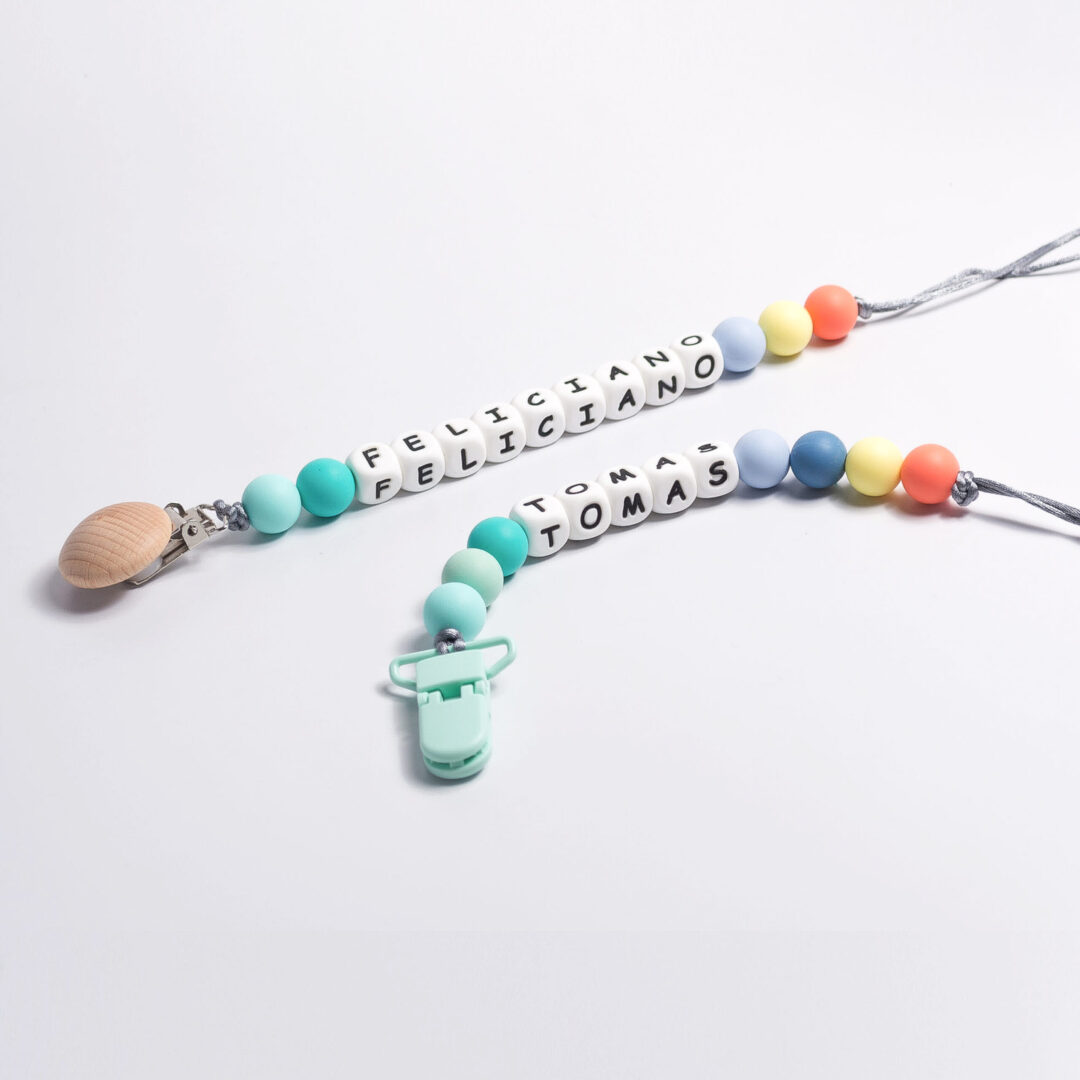 Porta chupete de madera con dijes combinados – Tonos neutros